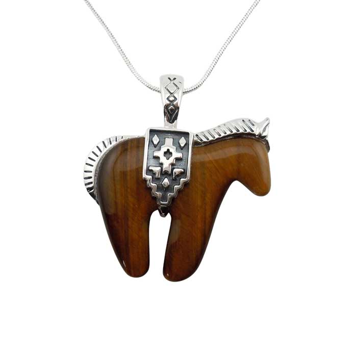 Tiger Eye Horse Necklace Pendant with decorative Sterling Silver mane and tail—and striking belly band. A magical horse indeed. An added detail is the large bail is hinged snapping securely close allowing you to add this Horse Pendant to a variety of necklaces from stones to Navajo pearls.